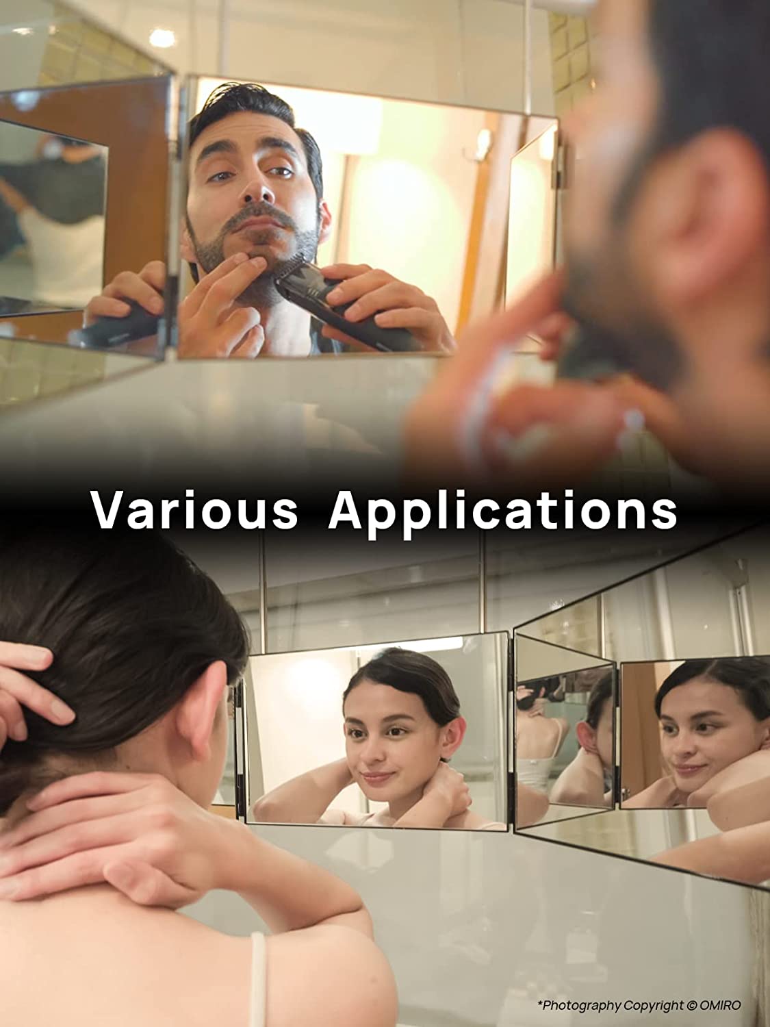 - HD & No Distortion - A three-way mirror made of real glass with no magnification, high definition distortion-free reflection. Great for achieving that perfect hairstyle from the front to the crown and towards the back of your head.