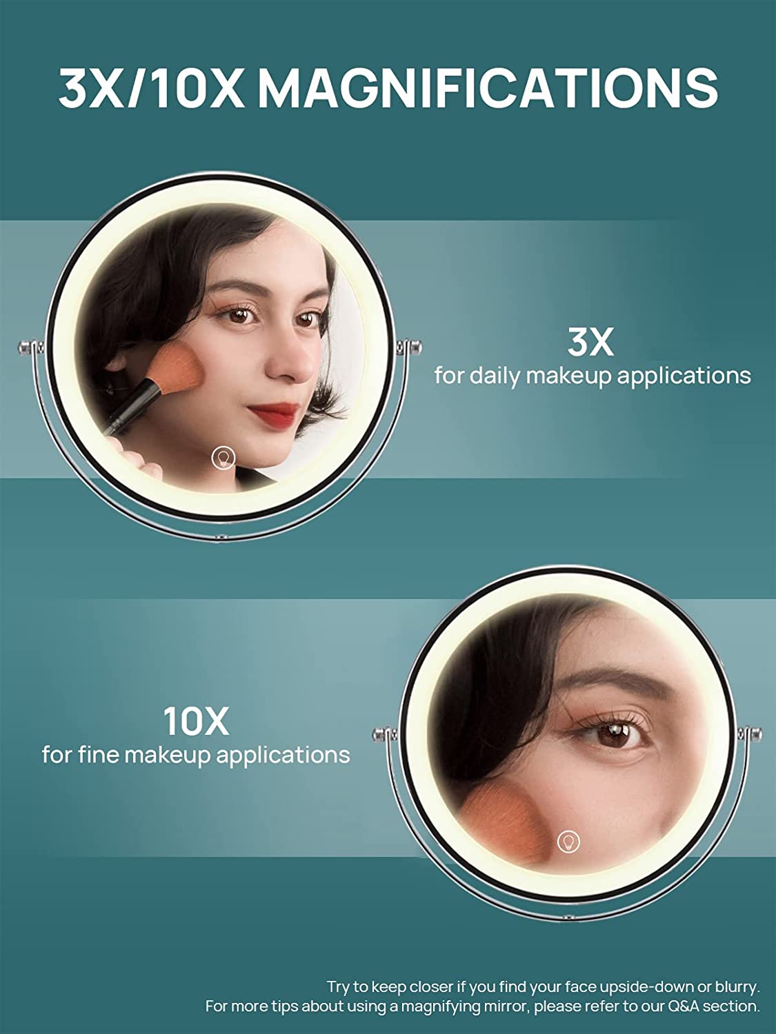 - 3X/10X Double Sided:2 distortion-free mirrors give you a clear, up-close view as you primp. On this LED makeup mirror, one side is 3X magnified view for precise makeup applications like applying eyeliner and wearing contact lenses, while the other side is 10X magnification for a high-precision applications like shaving and cleaning pores.