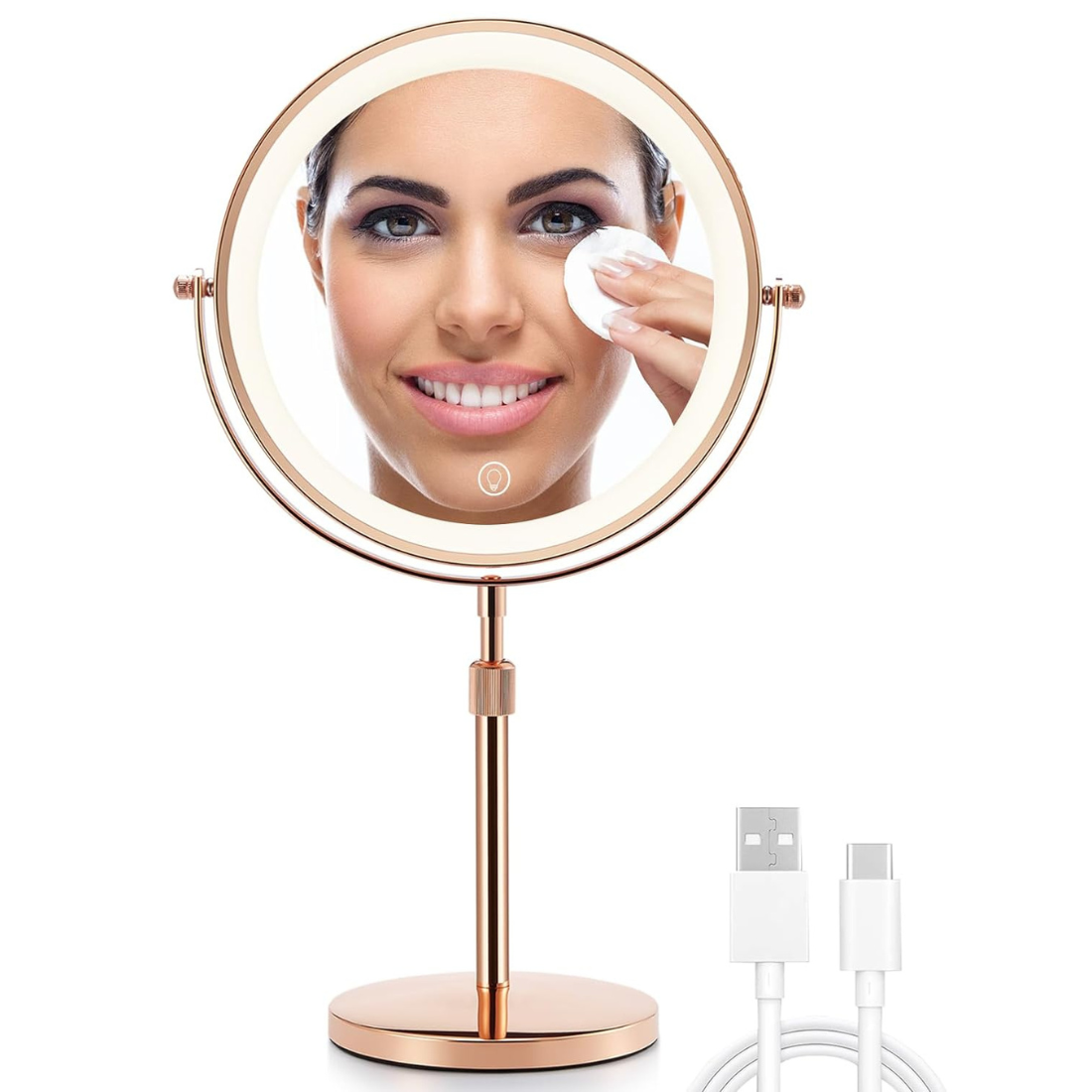 8.5 Inches Lighted Makeup Mirror with 3X/10X Magnifications, Double Sided Swivel Vanity Mirror with Height-Adjustable Stand (Rose Gold)